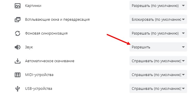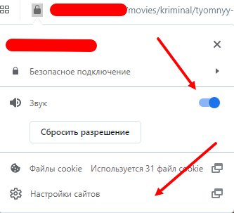 Если не помогло, возможно звук блокируется настройками браузера. Кликните на замок в адресной строке браузера (левее того места, где вы пишете адрес сайта), откроется окно, где будет строка с разрешениями и настройками. Если строки звука там нет, перейдите в настройки и включите звук в открывшейся вкладке (см. скриншоты ниже).